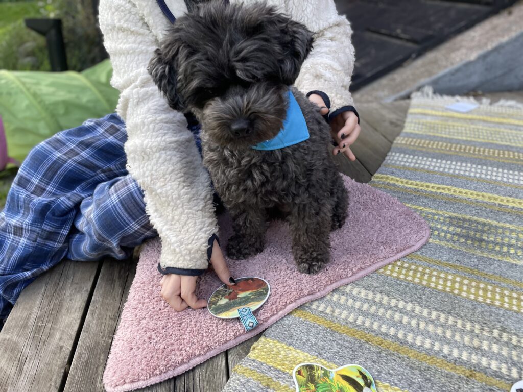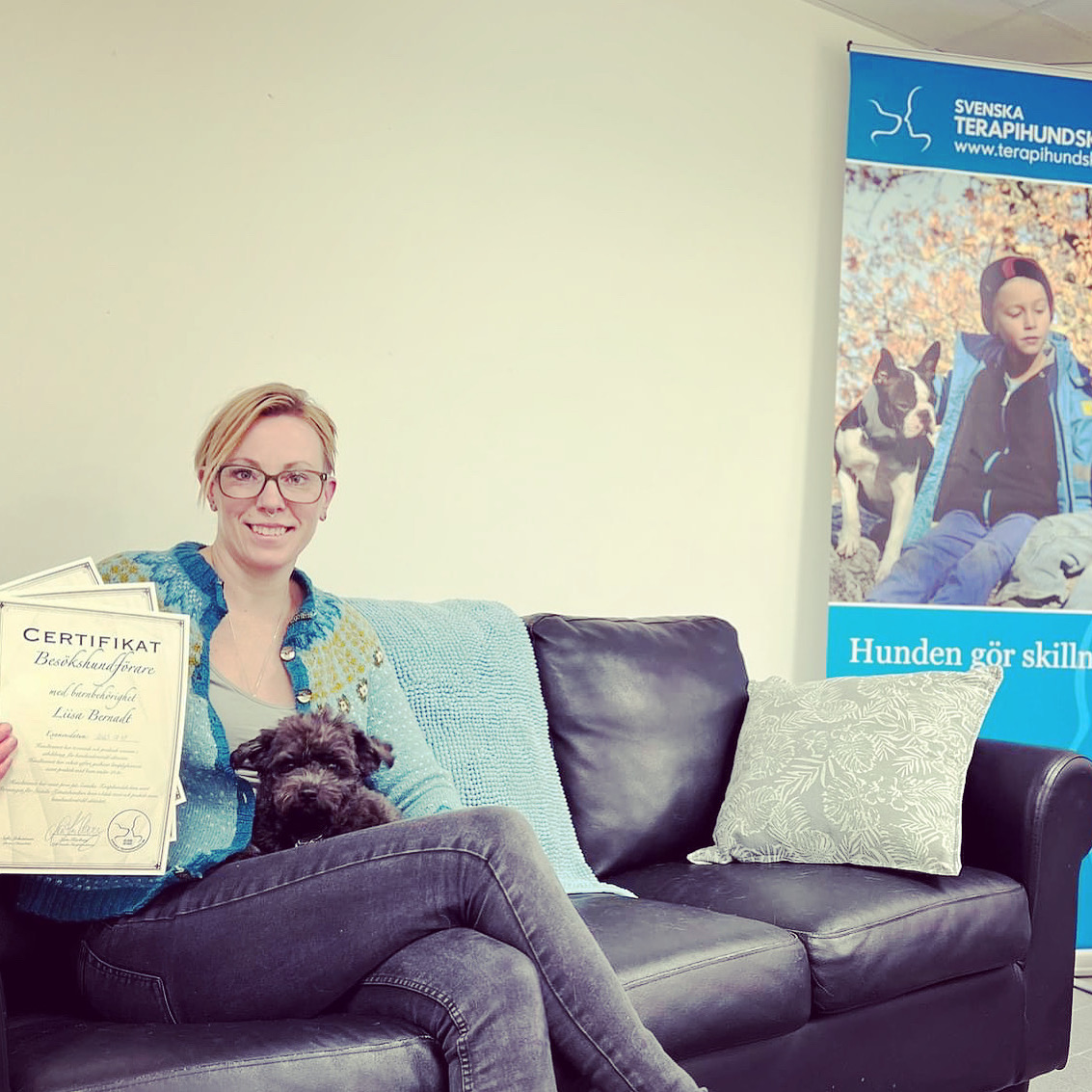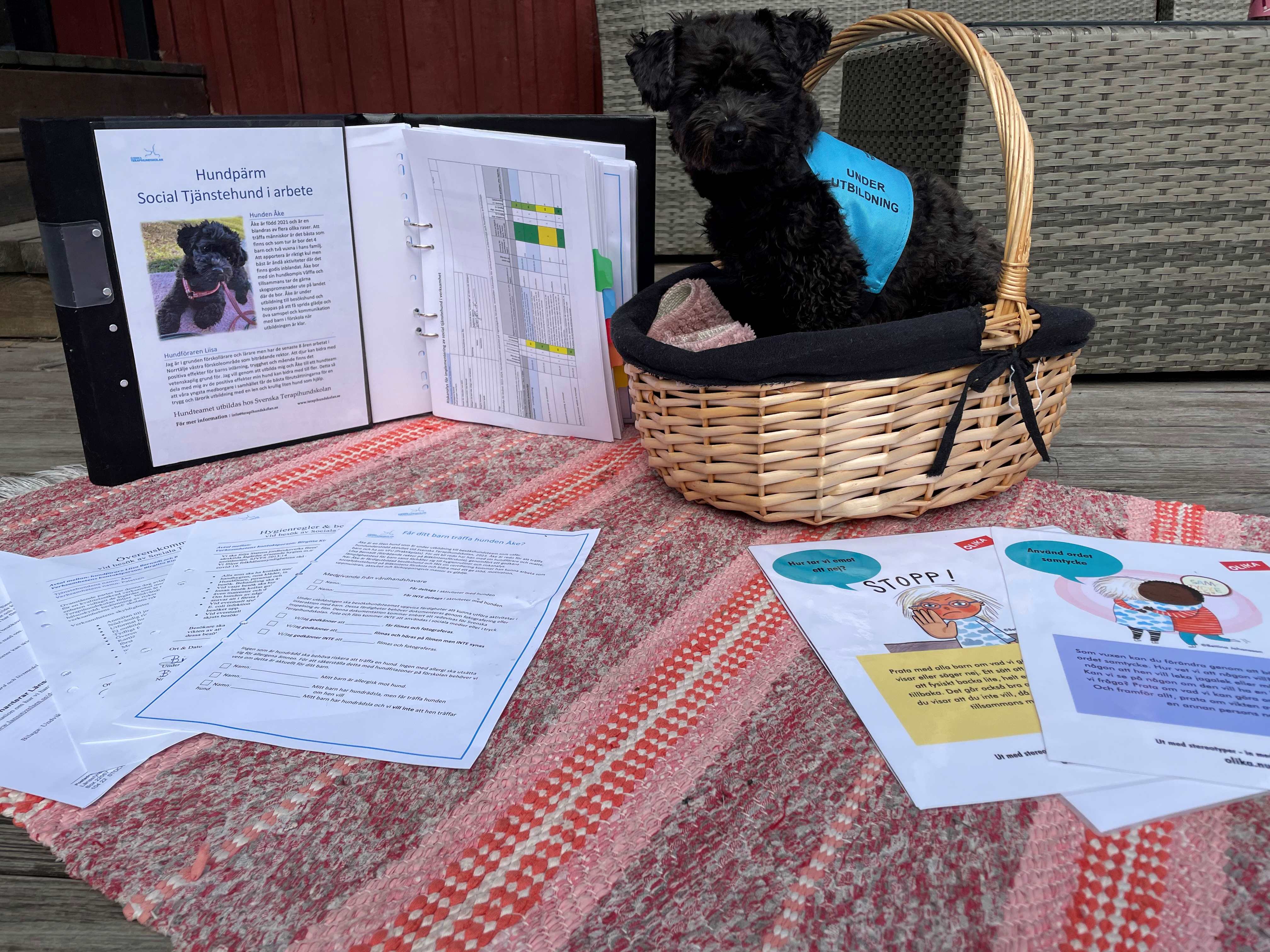 Vi är sedan december 2023 certifierade som besökshundteam med extra behörighet för yngre barn från Svenska terapihundskolan. Flera lämplighetstester har genomförts och vi som team har genomfört 15 timmar praktik på tre olika förskolor. Arbetsmaterial har jag skapat och arbetat fram under utbildningstiden och i mötet med de som anställt oss. Länsstyrelsen har beviljat oss tillstånd att, enligt djurskyddslagen 6 kap 4§, yrkesmässigt bedriva verksamhet med djur. För att se hur det kan gå till när vi arbetar, klicka här