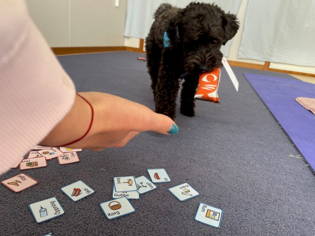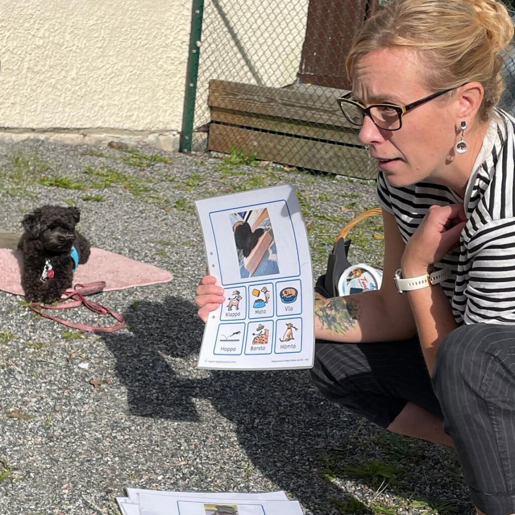 Genom roliga och engagerande övningar stimulerar vi barns språkutveckling och kommunikationsförmåga med hjälp av våra utbildade tjänstehundar.